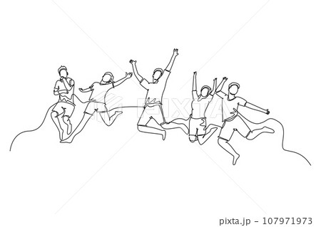 One line drawing of group of young happy male and female jumping together to celebrate their vacation