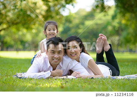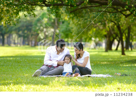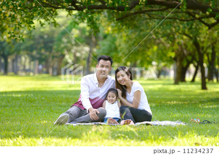 Young loving family couple & daughter in causal sitting on a mat in a park