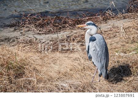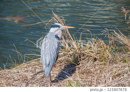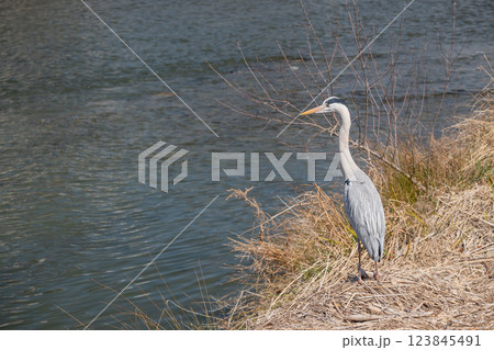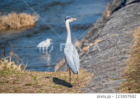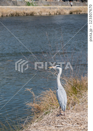 京都市鴨川河岸上站立的蒼鷺