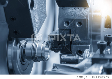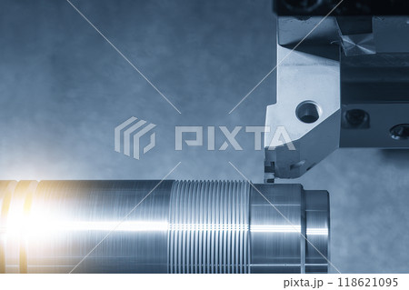 Close up scene the CNC lathe machine forming cutting the metal shaft part in the blue tone.