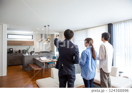 房屋銷售:銷售員展示樣品房,後視圖