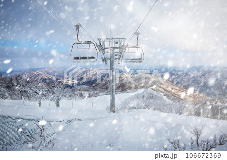 Cable car atop the snow-capped Deogyusan mountains at deogyusan national parkon a snowy day near Muju, South Korea.