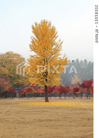 Ginkgo leaves and colorful flowers in autumn park with sky background Nami Island