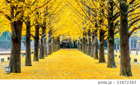 Row of yellow ginkgo tree in autumn. Autumn park in Tokyo, Japan.