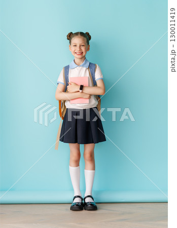 oh my god. stem disciplines. concept of education. measure the size. height of child. Portrait of school girl student, studio banner header. School child pupil face, copy space.