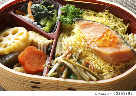 秋季味道午餐盒栗子飯和三文魚飯盒