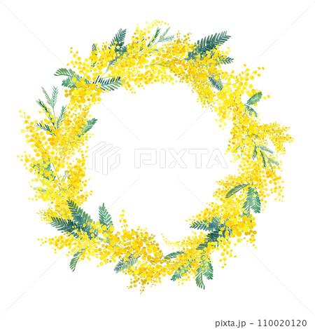 圓形裝飾框架與含羞草水彩插圖。 「國際婦女節」的圖像背景。