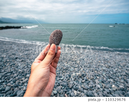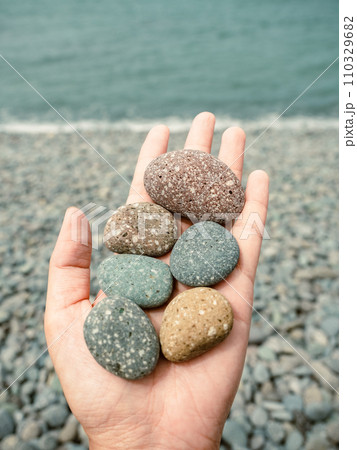 手拿各式色彩的海邊鵝卵石