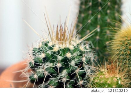 Cactus family - big round prickly cactus with two baby cacti, botanical garden