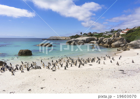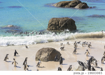一群野生非洲企鵝在南非巨石灘上休息(非洲企鵝)