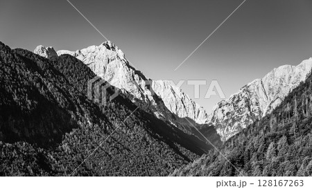 The striking peaks of Skrlatica, Prisank, Razor, and Triglav Mountains rise dramatically in the Julian Alps, showcasing their rugged beauty under a clear sky.
