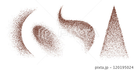Set of coffee dust and cocoa powder forms. 3D scattered granules in shapes - heart, wave, blob, and curve.