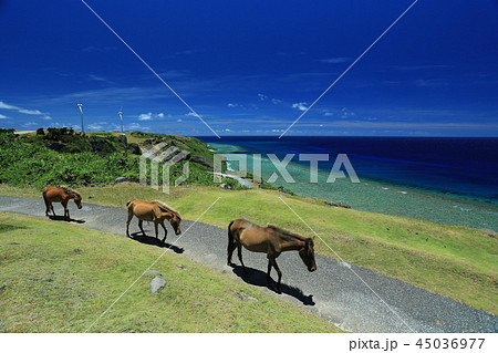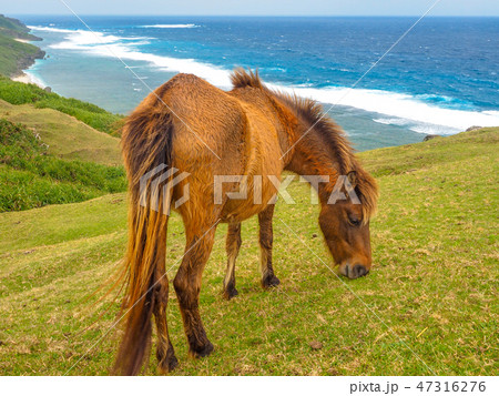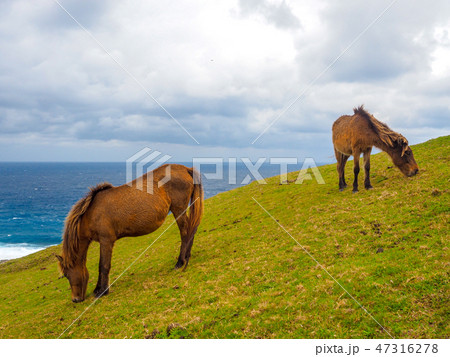 居住在土肥岬的天然紀念物三崎馬在牧場上吃草 | 馬圖片 | 宮崎縣串島市