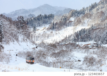 大糸線的柴油火車越過白雪皚皚的山脈,駛入城市。