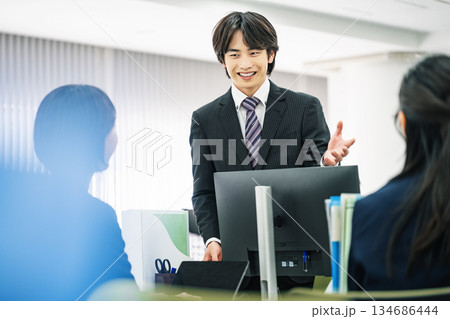 年輕的商人正在辦公室和同事交談