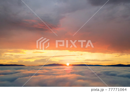 Aerial view of vibrant sunrise over white dense clouds with distant dark mountains on horizon.