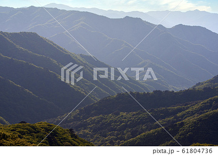 Aerial view of vast, forested landscape under clear blue sky. Rolling green hills stretch into distance, with clearing in foreground. Misty valleys and distant mountains create serene scene.