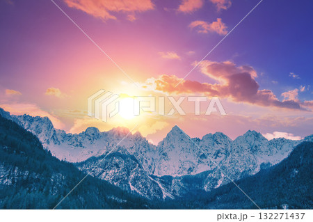 View of Alps in Kranjska Gora at sunrise. The tops of the mountains are covered with snow. Triglav national park. Slovenia, Europe