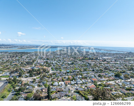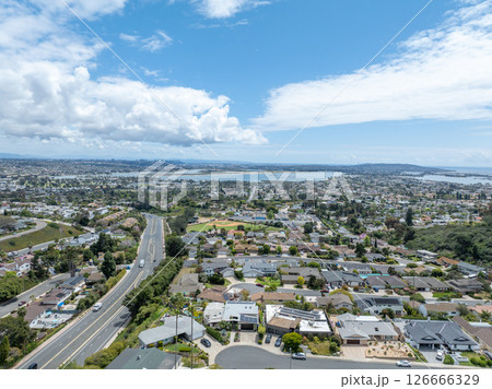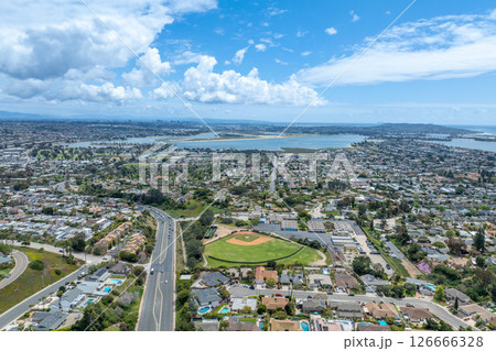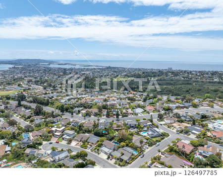 Aerial view of spacious family houses on lake Ontario shore in upstate New York suburban area. Real estate development in American suburbs