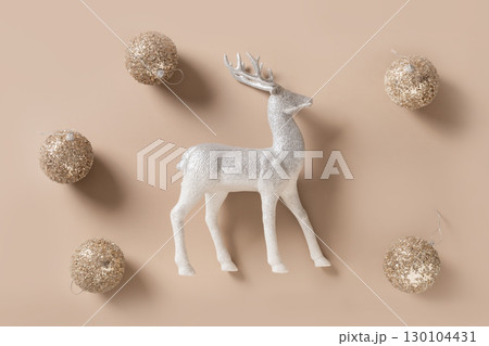 Christmas golden shiny baubles and silver deer figurine against beige background. Mocha Mousse. Creative Xmas card