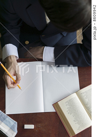 教室的桌子上放著筆記本、筆和筆袋。學校生活的形象,背景材料