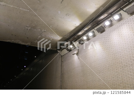 一道陽光照射在地下道的手扶梯上, 牆壁上還有黃綠紅三色的油漆
