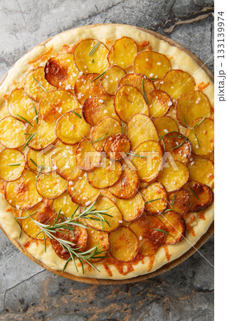 Potato and Rosemary Pizza is made with thinly sliced potatoes drizzled in olive oil and fresh rosemary and baked until crispy closeup on the wooden board. Vertical top view