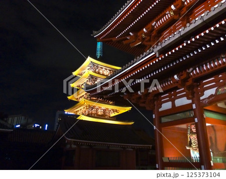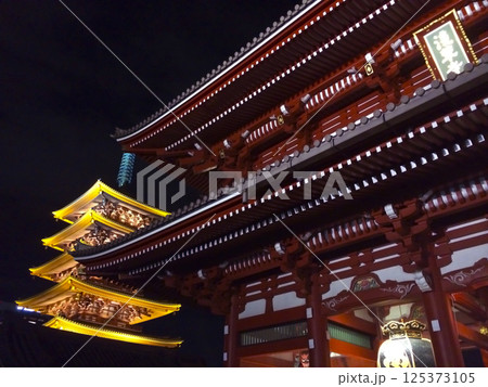 夜幕降臨,淺草的五重塔和淺草寺朱紅色的寶藏門在燈光下熠熠生輝。
