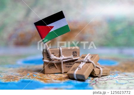 Flag of Palestine near the parcels on the world map. World trade. Exports and imports of goods. Economy of the country
