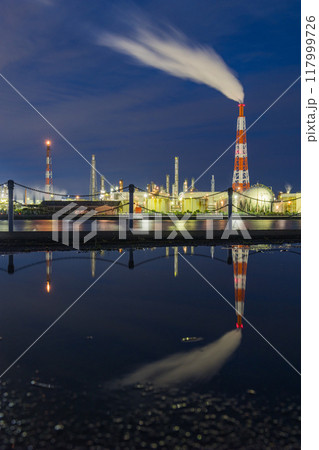 日本三重縣四日市市的四日市工業園區,工廠夜景倒映在水坑和冒著濃煙的煙囪上。