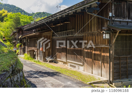 日本岐阜縣中津川市中山道宿間町馬遼宿的斜坡、街道和水磨坊