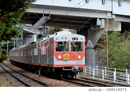 這是神戶電鐵3000系列的列車,為紀念50週年而以原來的顏色重新印刷。