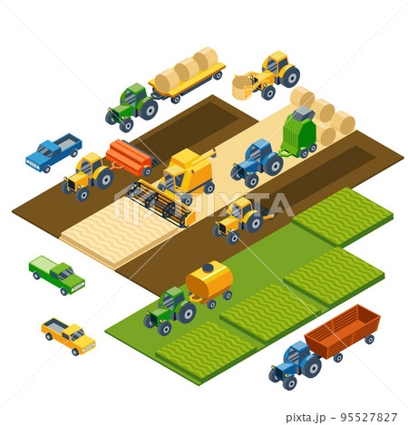 Isometric agricultural equipment, farm tractors, combain, trailers and pickup
