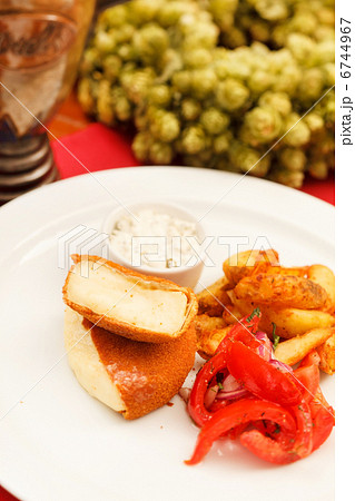 Fried dorada dressed with pesto served with vegetable garnish and lemon