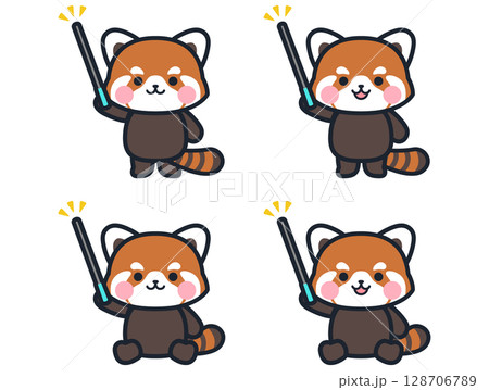 一組可愛的小紅熊貓插圖,手裡拿著一根指點棒