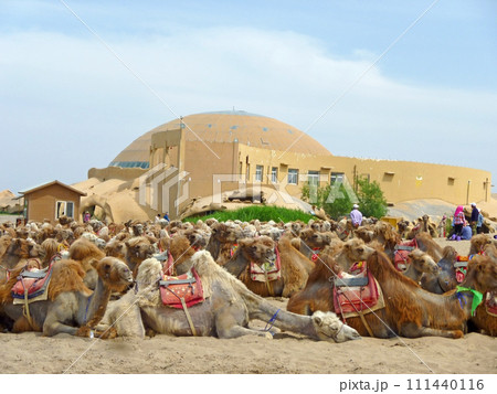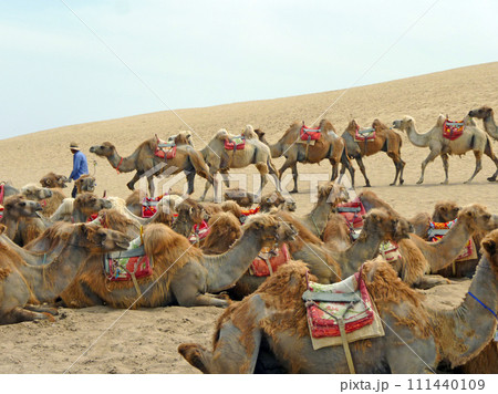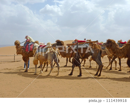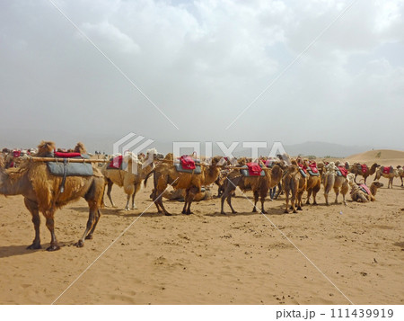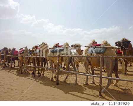 在寧夏沙波頭旅行時拍攝一群供旅客騎乘的駱駝在休息