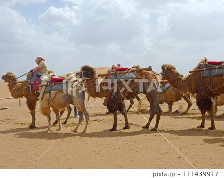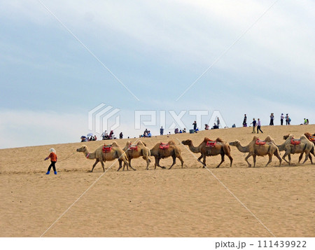 在寧夏沙波頭旅行時拍攝一群供旅客騎乘的駱駝在沙漠行走