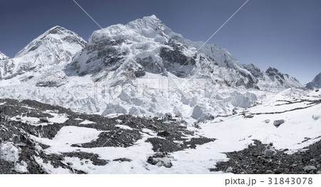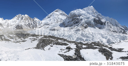 Panoramic view of himalayas mountains, Mount Everest and Khumbu Glacier from Kala Patthar - way to Everest base camp, Khumbu valley, Sagarmatha national park, Nepalese himalayas.