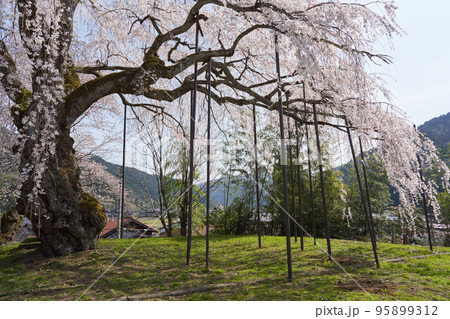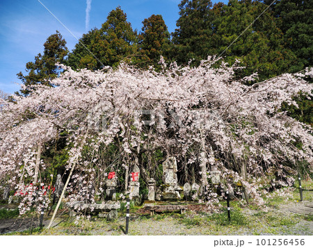 承泉寺的垂枝櫻花樹在春日的陽光下閃閃發光。 「天然紀念物,樹齡超過300年的垂枝櫻花」宮崎縣五瀨町