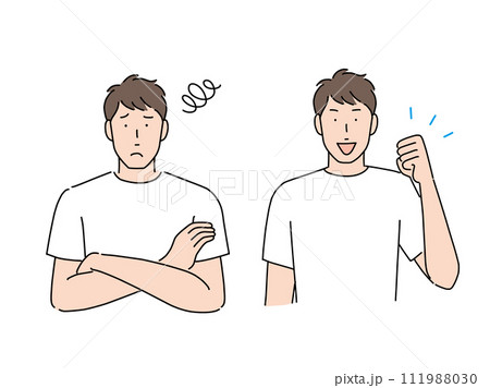 一群陷入困境並雙臂交叉的年輕人和一個解決問題並擺出勇氣姿勢的男人