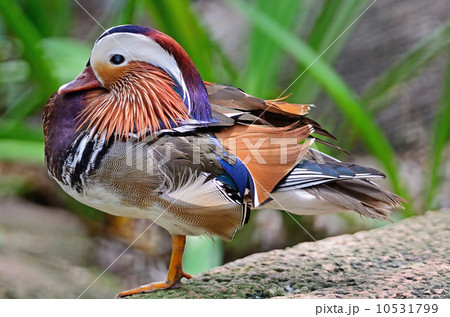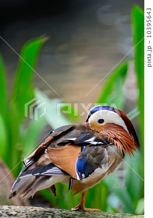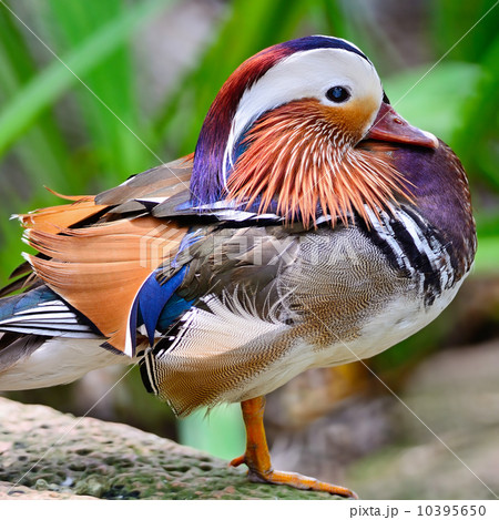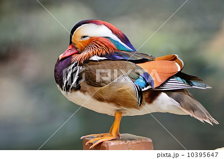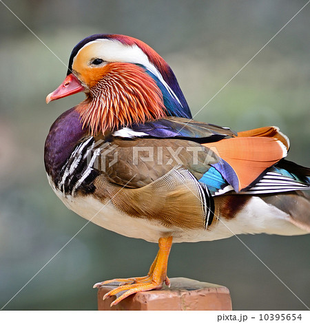 A beautiful male mandarin duck stands on a fence near the lake. Close-up photo. Nature and wild birds