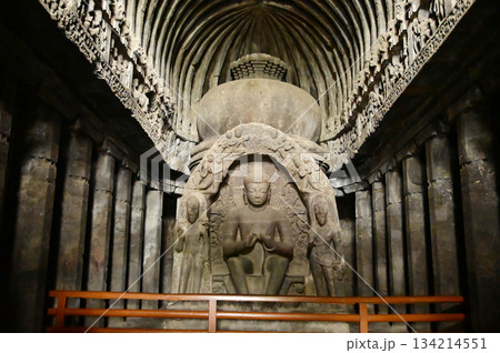Buddha statue in Cave No.10 of the Buddhist temple at Ellora Caves. Elora a UNESCO World Heritage Site, is one of the world's largest collections of rock-cut temples and shrines.