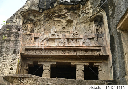 The entrance to Cave No. 12 in the Buddhist Ellora Caves, Elora, a UNESCO World Heritage Site, is one of the world's largest collections of rock-cut temples and shrines.