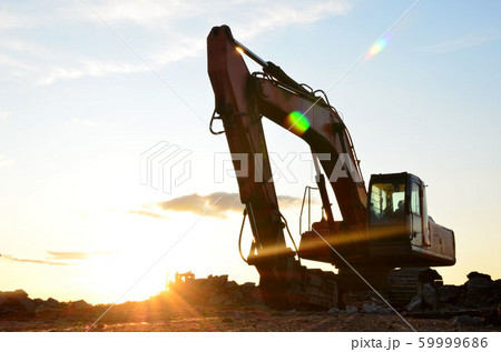 Large tracked excavator digs the ground for the foundation and construction of a new building
