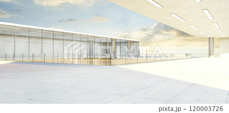 Industrial warehouse exterior, contemporary architecture, front view, demonstrating expansive structure, technology tone, Monochromatic Color Scheme