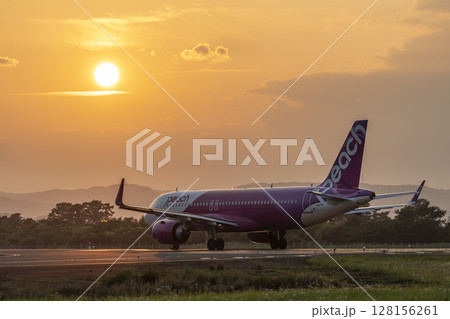 黃昏時分的仙台機場,飛機起飛,宮城縣名取市