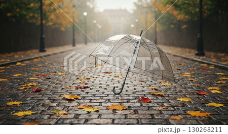 A clear umbrella lies discarded on a glistening cobblestone path, adorned with scattered colorful autumn leaves, set against a misty, tree-lined street scene.