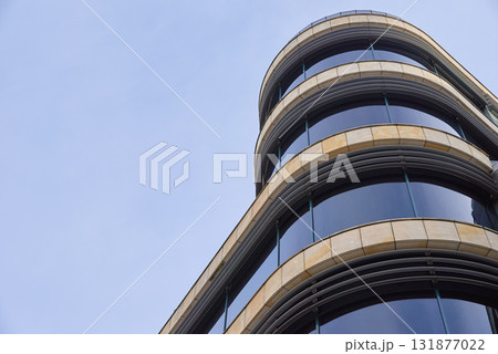 Modern office building with glass facade on a clear sky background. Transparent glass wall of office building.
