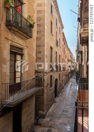 Historic narrow street lined with classic european buildings in Barcelona featuring wrought iron balconies