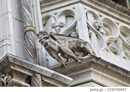Gargoyle perched on historic structure in Blois, France, showcasing intricate stonework details